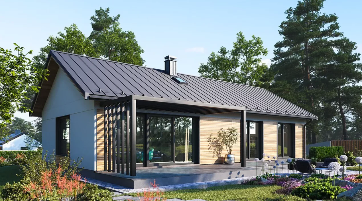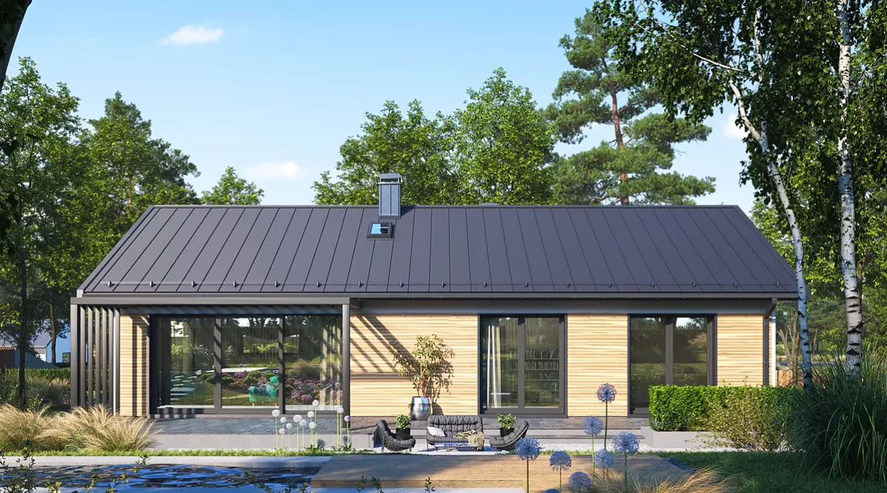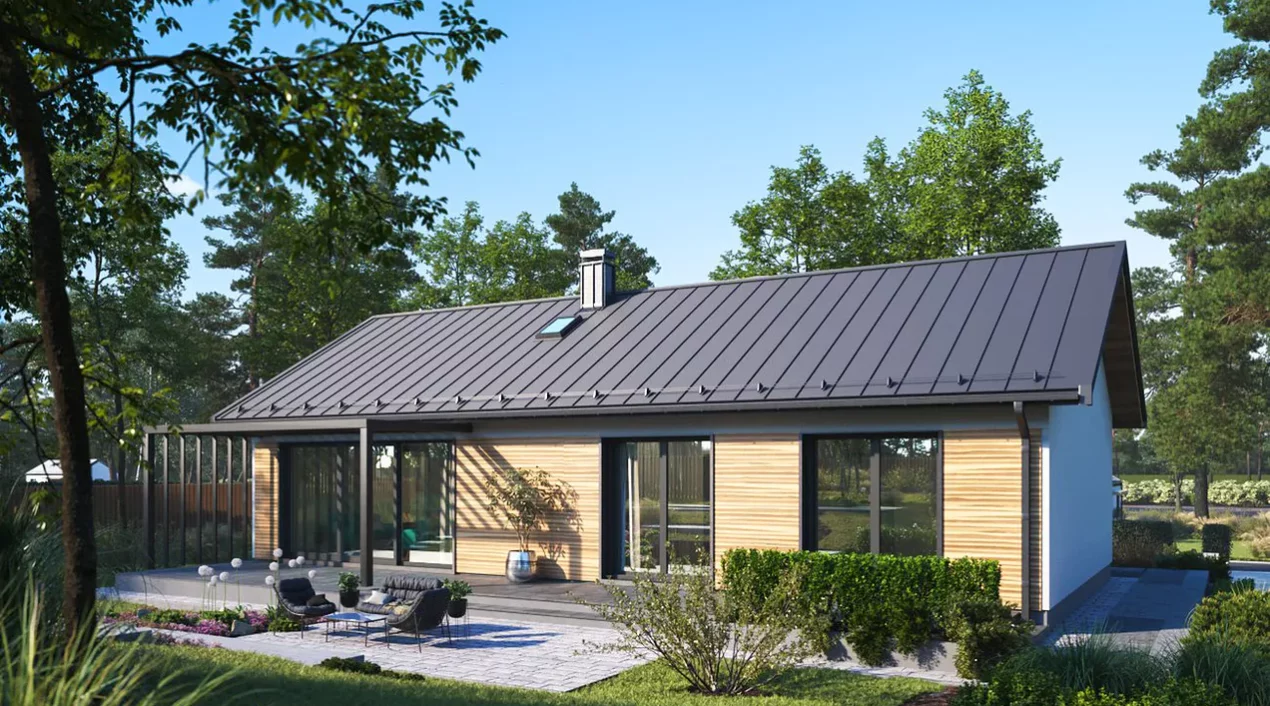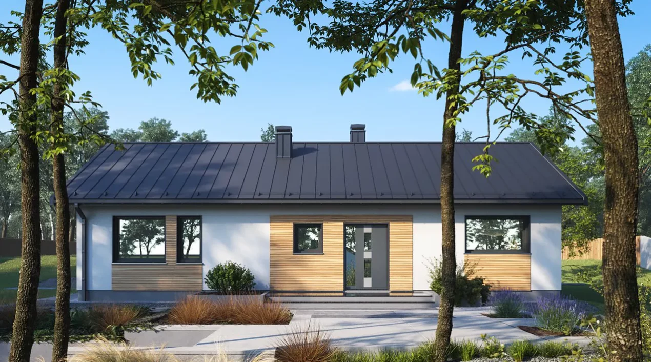 Bryła budynku wyróżnia się prostotą, podkreśloną dwuspadowym dachem. Duże przeszklenia od strony ogrodu wprowadzają dużo naturalnego światła i umożliwiają piękne widoki na otaczającą przyrodę. Przy tarasie przewidziano trejaż, który dodaje całości lekkości i nowoczesnego charakteru. W projekcie uwzględniono również praktyczne pomieszczenie gospodarcze, mogące pełnić rolę pralni, oraz spiżarnię i garderobę, co sprzyja utrzymaniu porządku w domu.