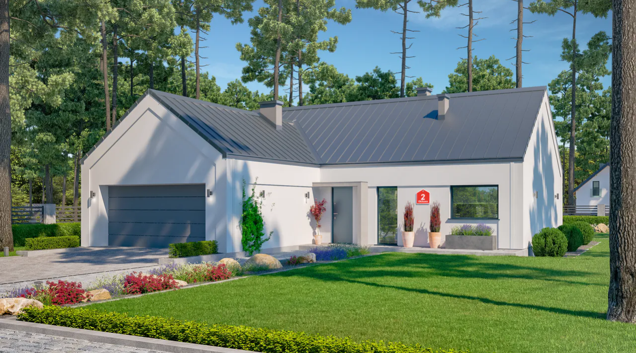Projekt domu Dom przy Olchowej 2 to funkcjonalny, parterowy dom jednorodzinny o powierzchni użytkowej 138,85 m² z dwustanowiskowym garażem, idealny dla 4–5-osobowej rodziny, z prostą murowaną konstrukcją, dwuspadowym dachem, przestronnym salonem połączonym z kuchnią, czterema sypialniami, łazienką, osobnym WC, kotłownią i wiatrołapem, zaprojektowany z myślą o komforcie, energooszczędności i łatwej budowie zgodnej z WT 2021. Dwustanowiskowy garaż z bezpośrednim przejściem do części mieszkalnej zwiększa wygodę codziennego użytkowania i sprawdzi się zarówno w mieście, jak i na działce podmiejskiej.