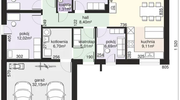 Wymiary zewnętrzne budynku: 14,65 x 15,20 m
