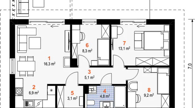 Wymiary zewnętrzne budynku: 7,0 x 12,2 m