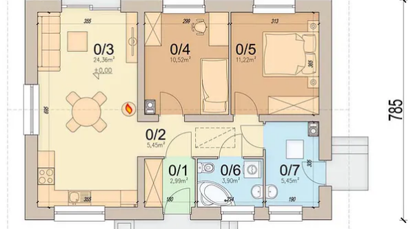 Wymiary zewnętrzne budynku: 7,85 x 10,90m