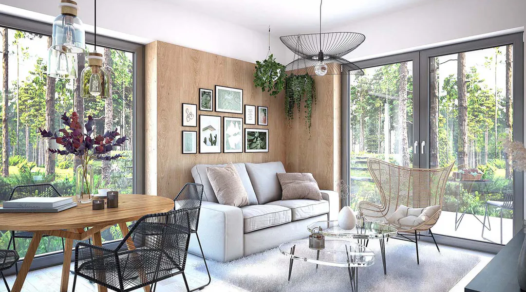 Projekt domu Mirabelka 2 to parterowy budynek o starannie zaplanowanym układzie wnętrz, idealnie dopasowanym do potrzeb nowoczesnej rodziny. Serce domu stanowi jasny i przestronny salon z jadalnią i kuchnią, tworząc przyjazną przestrzeń do codziennego wypoczynku i wspólnego spędzania czasu. W projekcie przewidziano również dodatkowe pokoje, które można dowolnie wykorzystać jako sypialnie, gabinet lub pokój dla gości. Komfort codziennego użytkowania podnoszą przestronna łazienka oraz wygodne pomieszczenie gospodarcze.